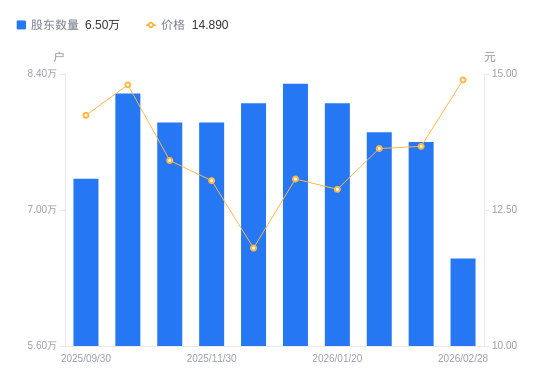 近一年(2025年2月28日至2026年2月28日),潞安环能A股股东户数从7.2万户,减低至6.5万户,降幅9.72%,区间股价上涨26.29%。