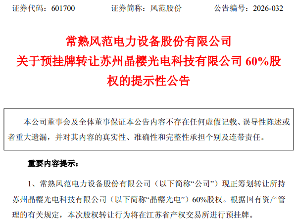 3月24日晚,风范股份公告称,为进一步聚焦主责主业,现正筹划转让所持苏州晶樱光电科技有限公司(以下简称“晶樱光电”)60%股权。