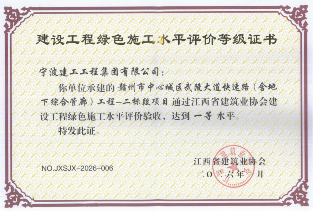 近日,由宁波建工(601789)集团承建的赣州市中心城区武陵大道快速路(含地下综合管廊)工程二标段项目,斩获江西省建筑业协会建设工程绿色施工水平评价一等水平证书。这既是项目深入推进绿色建造、践行生态优先理念的切实成效,也展现了公司在绿色施工领域的综合实力。