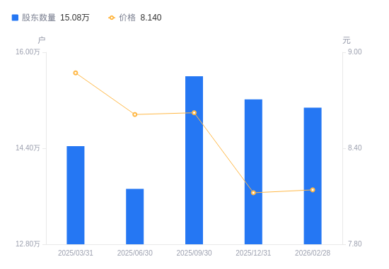近一年(2025年2月28日至2026年2月28日),中国交建A股股东户数从14.37万户,增加至15.08万户,增幅4.91%,区间股价下跌13.69%。