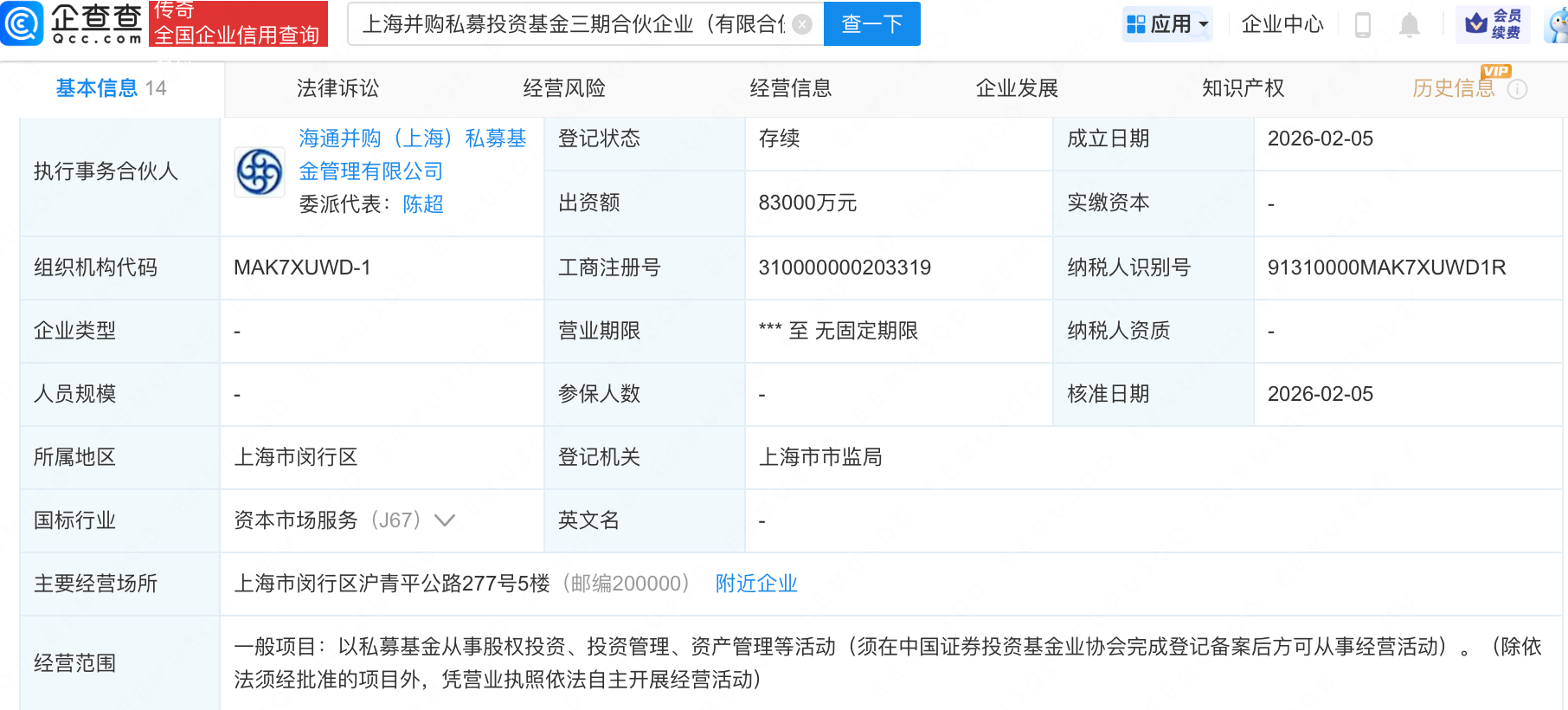 企查查APP显示,近日,上海并购私募投资基金三期合伙企业(有限合伙)成立,出资额8.3亿元,经营范围包含:以私募基金从事股权投资、投资管理、资产管理等活动。企查查股权穿透显示,该企业由长芯博创(300548)(300548.SZ)、长飞光纤(601869)(601869.SH)全资子公司武汉市长飞资本管理有限责任公司等共同出资。