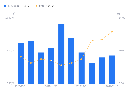 近一年(2025年2月20日至2026年2月10日),招商轮船A股股东户数从11.09万户,减低至8.57万户,降幅22.73%,区间股价上涨95.12%。