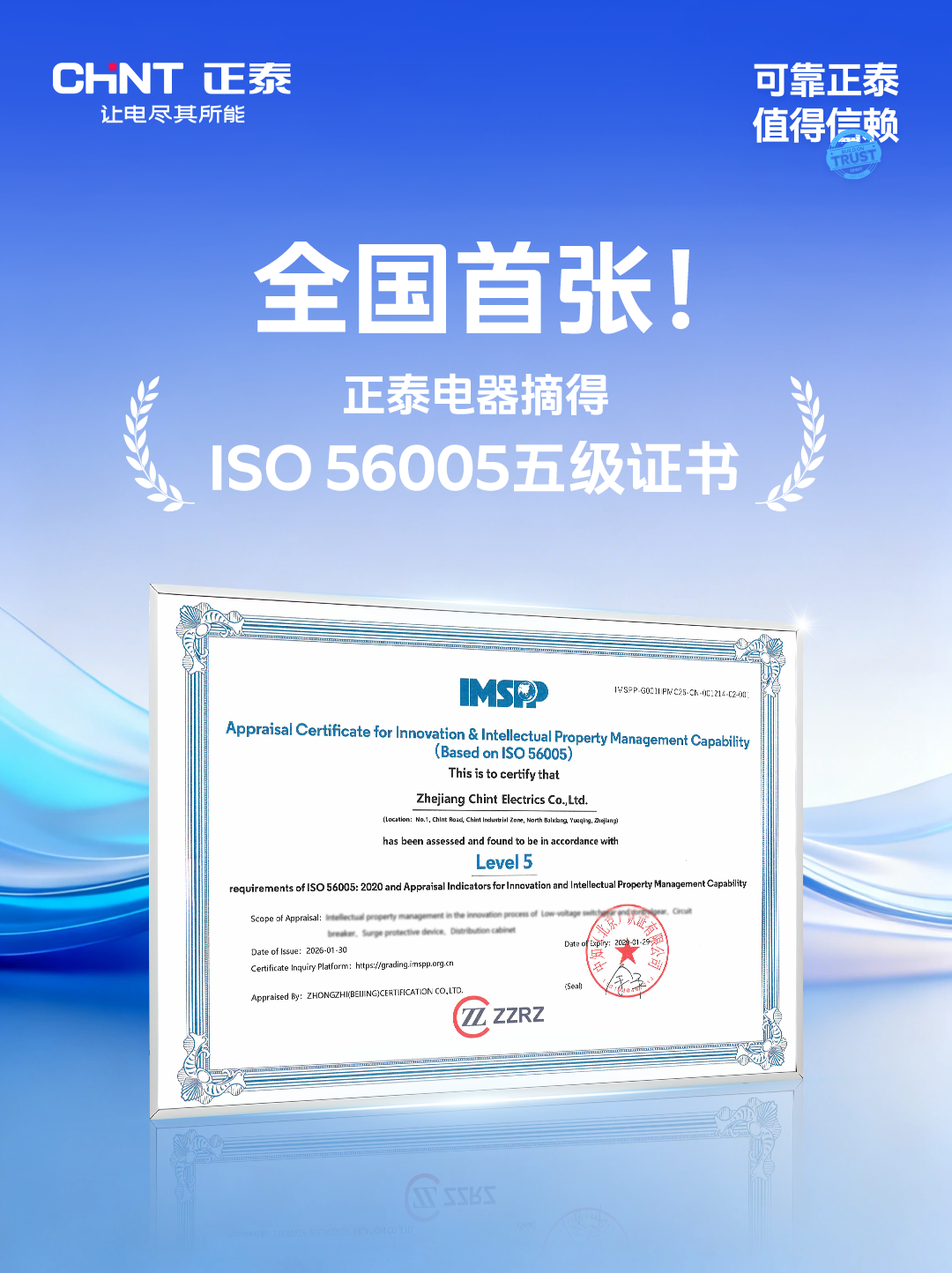 ISO 56005《创新管理-知识产权管理指南》,是我国率先提出并主导制定的首个知识产权管理国际标准,凝聚了全球创新与知识产权领域专家智慧,更是ISO 56000系列创新管理标准体系的核心内容。该标准将知识产权管理深度融入创新全流程,强调知识产权管理的终极价值在于为企业及相关方创造多元价值,并通过五级分级评价量化管理能力,其中五级(生态级)为最高等级,要求企业实现创新与知识产权管理的战略级协同,能以知识产权为纽带赋能产业生态构建,其认证门槛高、评价维度全,是全球创新管理领域的权威标尺。作为我国知识产权体系建设的先行者,正泰早在2014年获得全国1号知识产权体系认证证书,本次斩获全国首张ISO 56005创新与知识产权管理五级最高认证,更是标志着其全流程创新能力与领先的知识产权管理水平获国际权威认可。通过为客户提供更创新、更可靠、更合规、更具竞争力的产品和解决方案,正泰全力护航客户抢占市场先机,也让“值得信赖”的品牌形象更加深入人心。
