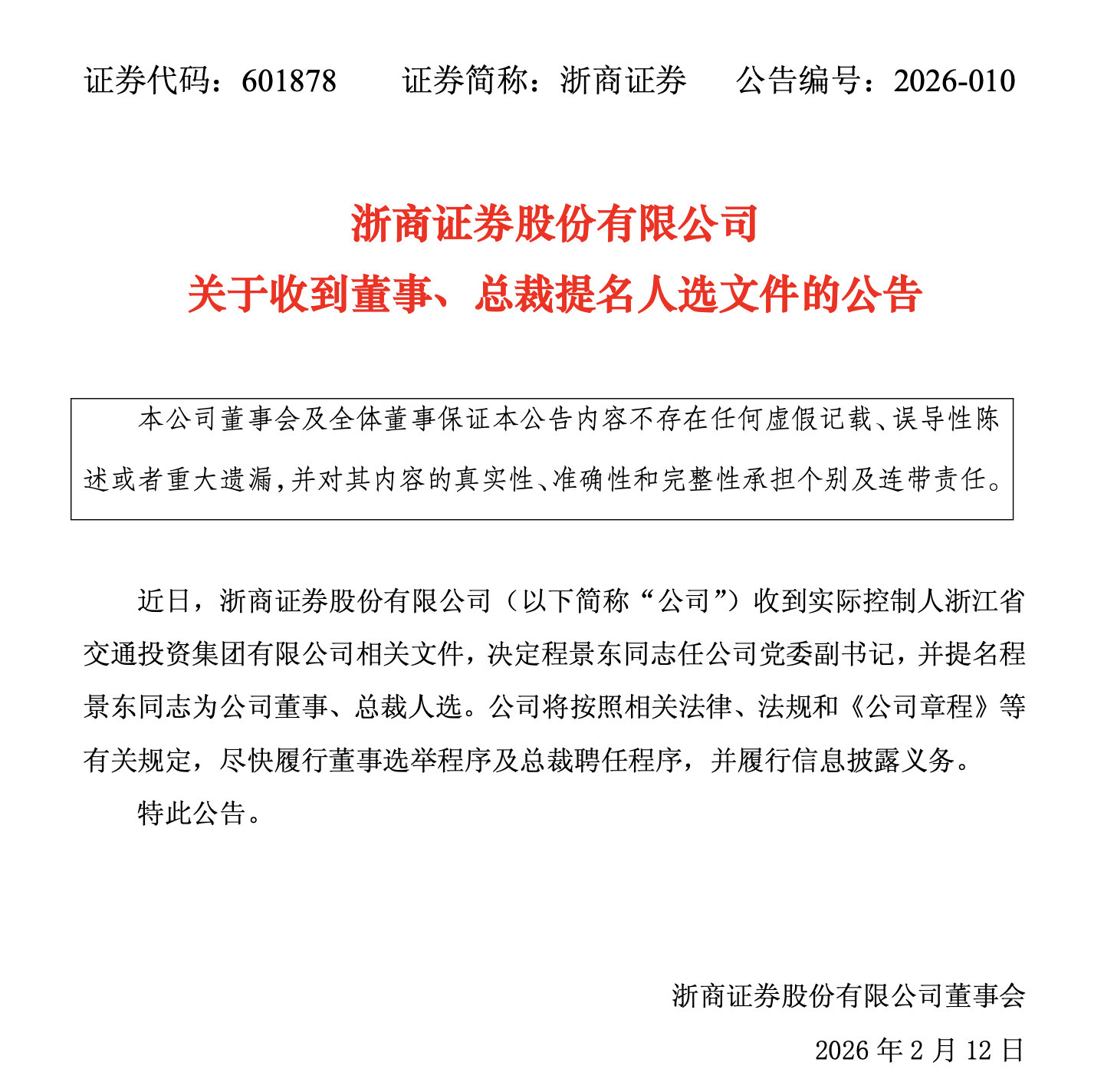 2026年2月11日晚间,浙商证券(601878)一则人事公告引发市场关注,公司实际控制人浙江省交通投资集团有限公司正式决定:现任党委委员、副总裁程景东出任党委副书记,并被提名为董事、总裁人选。这位1970年1月出生的“博士高管”,在2019年加盟浙商证券、分管投行近七年后,正式走向台前,填补了自2025年10月董事长钱文海“一肩挑”以来近四个月的总裁空缺。