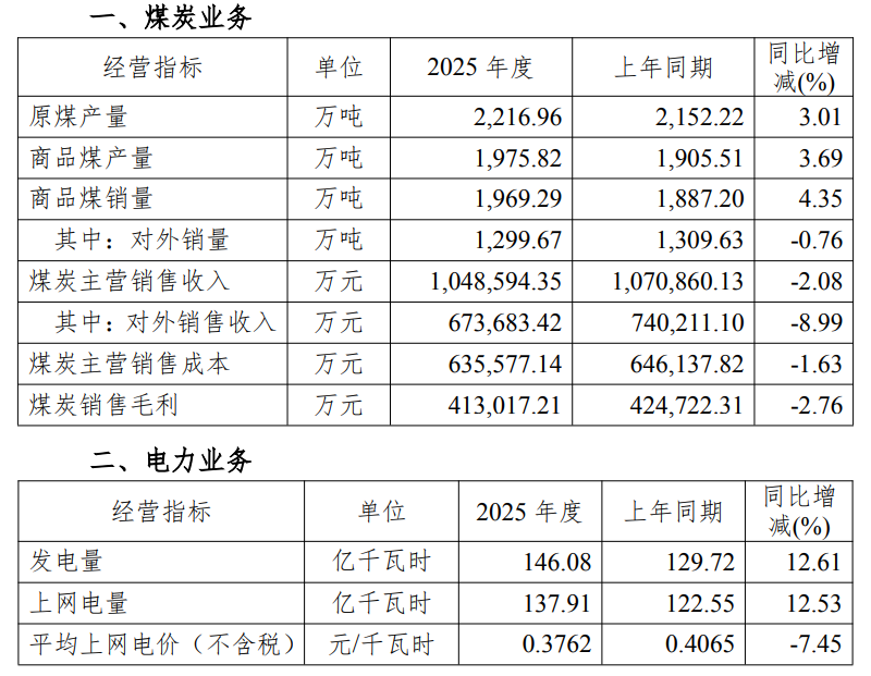 在电力业务方面,2025年度公司完成发电量146.08亿千瓦时,同比增长12.61%;上网电量为137.91亿千瓦时,同比增长12.53%;公司电力业务全部在安徽地区,全部为火电。具体数据如下: