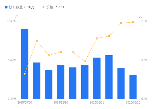 3月27日消息,数据显示,截至2026年2月28日,新集能源A股股东总户数为8.47万户,较上期(2026年2月10日)减少5341户,降幅5.93%。公司最新A股总股本为25.91亿股,其中流通A股25.91亿股,户均持有流通A股数量为3.06万股,较上期增加1815.92股,增幅6.31%;户均持流通A股市值23.68万元,较上期增加2.56万元,增幅12.10%。