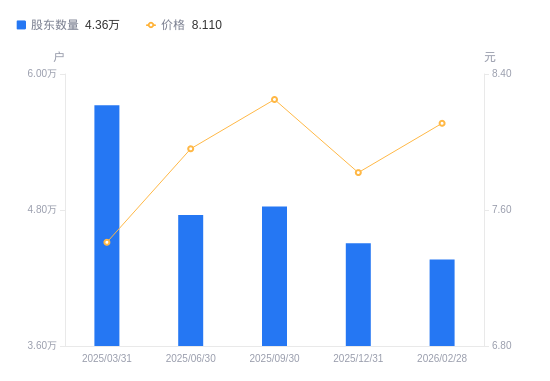 近一年(2025年3月31日至2026年2月28日),浙版传媒A股股东户数从5.73万户,减低至4.36万户,降幅23.80%,区间股价上涨8.13%。
