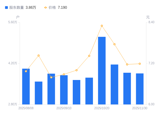 近一年(2024年12月20日至2025年11月30日),东贝集团A股股东户数从2.63万户,增加至3.86万户,增幅46.68%,区间股价上涨41.54%。