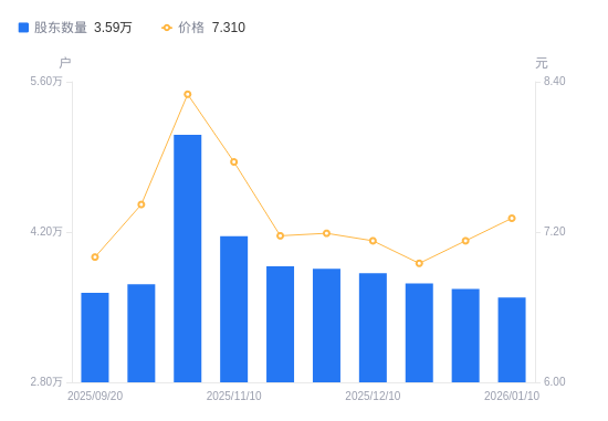 近一年(2025年1月10日至2026年1月10日),东贝集团A股股东户数从2.65万户,增加至3.59万户,增幅35.44%,区间股价上涨60.31%。
