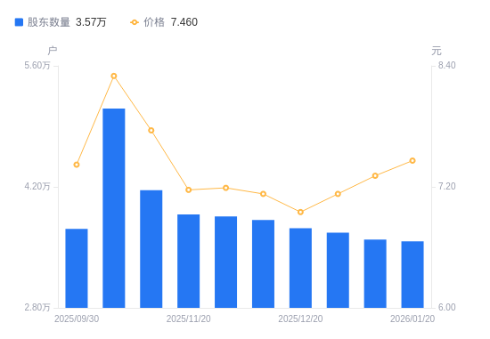 近一年(2025年1月20日至2026年1月20日),东贝集团A股股东户数从2.69万户,增加至3.57万户,增幅32.77%,区间股价上涨63.24%。