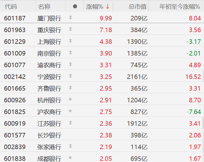 格隆汇2月5日|A股市场银行股午后涨幅进一步扩大,其中,厦门银行涨停,重庆银行涨超7%,上海银行涨超4%,南京银行、渝农商行、宁波银行涨超3%。