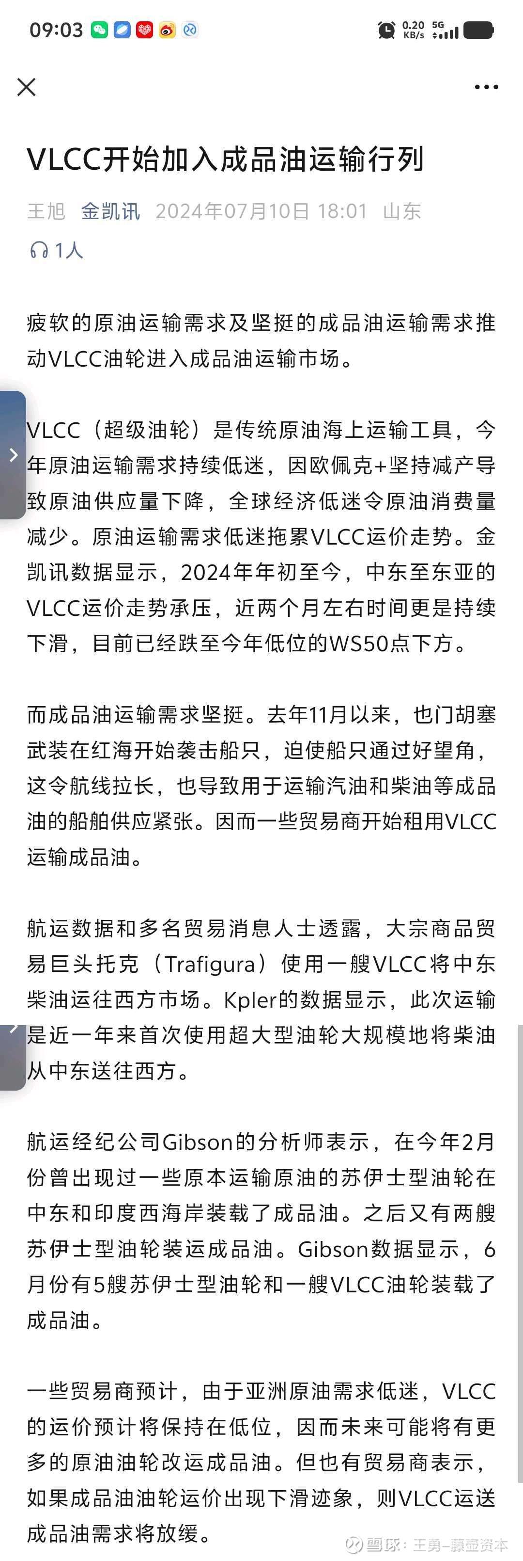 很复杂,现在应该就是震荡。最好的局面就是欧佩克增产,油价低位,这样中国会增加原油存储。而油运真的大爆发,除了vlcc到十万,也要成品油起来,他们是相互流动的。之前原油运费低很多船去拉成品油了,现在原油运费大涨,会出现这些船开始回归原油船,那后面必然出现成品油运费上涨,原油运费缓慢...
