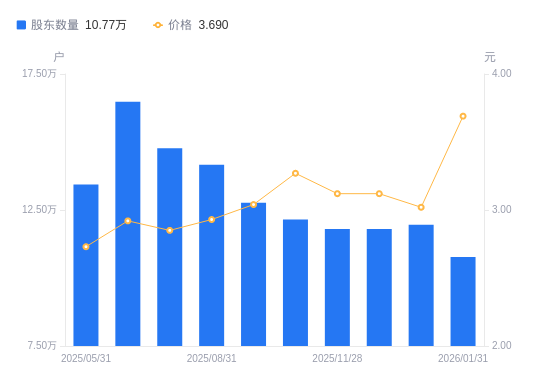 近一年(2025年1月31日至2026年1月31日),招商南油A股股东户数从12.62万户,减低至10.77万户,降幅14.63%,区间股价上涨16.04%。
