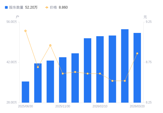 近一年(2025年3月31日至2026年3月20日),中国核电A股股东户数从35.98万户,增加至52.2万户,增幅45.07%,区间股价下跌2.74%。