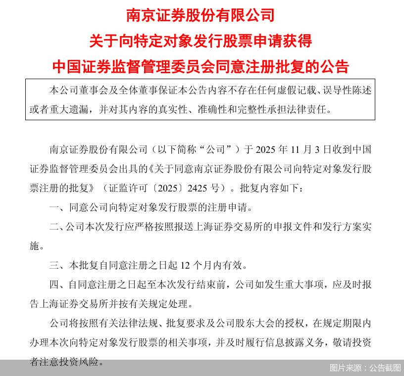 北京商报讯(记者 刘宇阳)11月3日,南京证券(601990)发布公告称,公司于当日收到中国证监会出具的《关于同意南京证券股份有限公司向特定对象发行股票注册的批复》,同意南京证券向特定对象发行股票的注册申请。