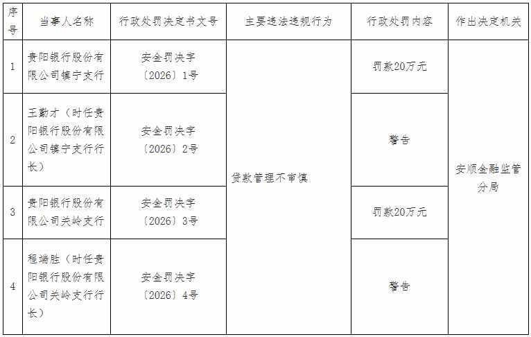 【大河财立方消息】1月8日,国家金融监督管理总局安顺监管分局披露的行政处罚信息显示,因贷款管理不审慎,贵阳银行(601997)镇宁支行、关岭支行均被罚20万元,合计罚款40万元,时任镇宁支行行长王勤才、时任关岭支行行长程端胜二人均被警告。