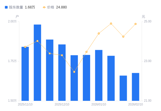 近一年(2025年2月10日至2026年2月10日),鼎龙科技A股股东户数从2.15万户,减低至1.68万户,降幅22.09%,区间股价上涨19.33%。