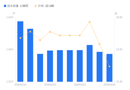 3月23日消息,数据显示,截至2026年3月20日,鼎龙科技A股股东总户数为1.66万户,较上期(2026年3月10日)减少103户,降幅0.62%。公司最新A股总股本为2.36亿股,其中流通A股5888万股,户均持有流通A股数量为3550.2股,较上期增加21.91股,增幅0.62%;户均持流通A股市值7.88万元,较上期减少5652.98元,降幅6.70%。
