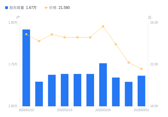 4月1日消息,数据显示,截至2026年3月31日,鼎龙科技A股股东总户数为1.67万户,较上期(2026年3月20日)增加147户,增幅0.89%。公司最新A股总股本为2.36亿股,其中流通A股5888万股,户均持有流通A股数量为3519.01股,较上期减少31.19股,降幅0.88%;户均持流通A股市值7.59万元,较上期减少2838.71元,降幅3.60%。