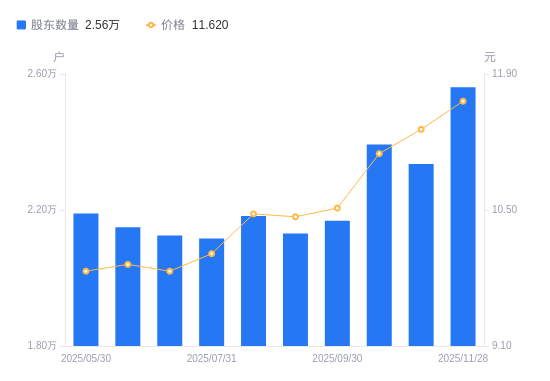 近一年(2024年12月31日至2025年11月28日),万盛股份A股股东户数从2.29万户,增加至2.56万户,增幅11.89%,区间股价上涨11.82%。