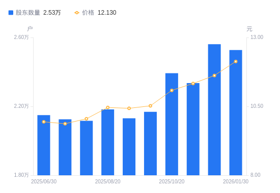 近一年(2025年2月28日至2026年1月30日),万盛股份A股股东户数从2.39万户,增加至2.53万户,增幅5.65%,区间股价上涨16.05%。