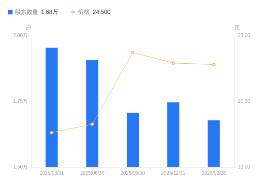 3月27日消息,数据显示,截至2026年2月28日,亚普股份A股股东总户数为1.68万户,较上期(2025年12月31日)减少681户,降幅3.90%。公司最新A股总股本为5.08亿股,其中流通A股5.08亿股,户均持有流通A股数量为3.03万股,较上期增加930.41股,增幅3.17%;户均持流通A股市值74.2万元,较上期增加1.78万元,增幅2.46%。