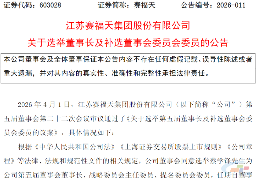 4 月 1 日晚,赛福天(603028)发布公告称,公司董事会同意选举蔡学峰为公司第五届董事会董事长、战略委员会主任委员、提名委员会委员,任期自董事会审议通过之日起生效,至公司第五届董事会任期届满时为止。