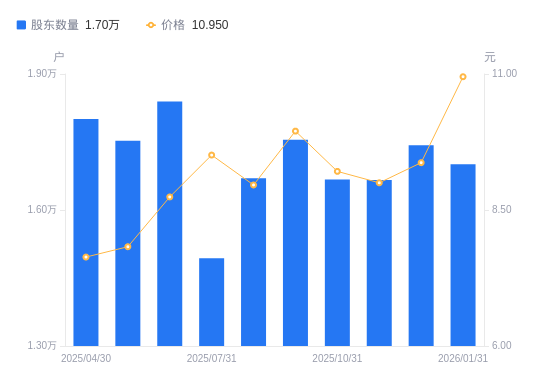 近一年(2025年1月31日至2026年1月31日),永吉股份A股股东户数从1.51万户,增加至1.7万户,增幅12.50%,区间股价上涨19.35%。
