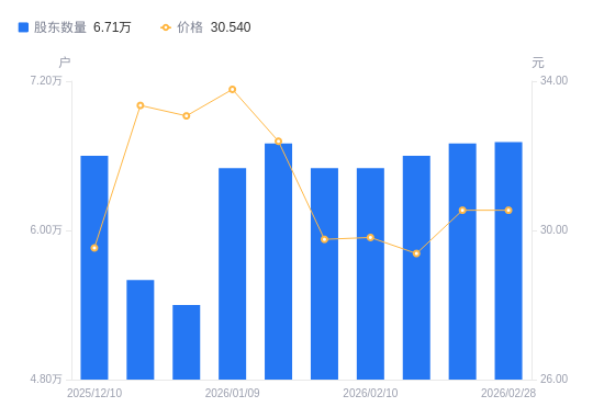 近一年(2025年2月28日至2026年2月28日),禾望电气A股股东户数从3.24万户,增加至6.71万户,增幅107.12%,区间股价上涨1.53%。