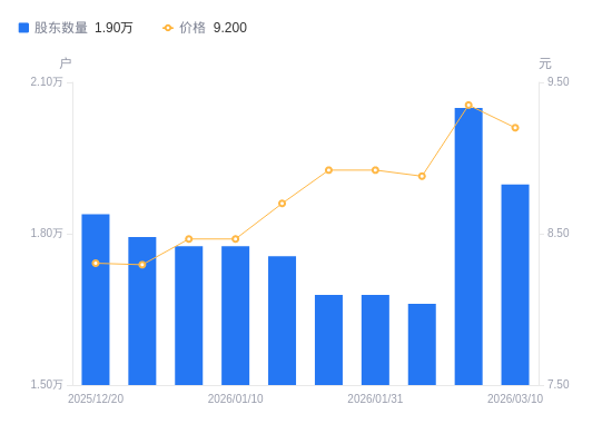 3月12日消息,数据显示,截至2026年3月10日,宿迁联盛A股股东总户数为1.9万户,较上期(2026年2月27日)减少1516户,降幅7.40%。公司最新A股总股本为4.19亿股,其中流通A股1.97亿股,户均持有流通A股数量为1.04万股,较上期增加766.6股,增幅7.99%;户均持流通A股市值9.53万元,较上期增加5613.21元,增幅6.26%。