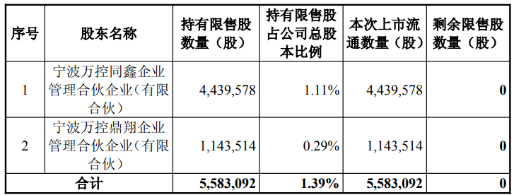 3月4日,万控智造(603070)发布公告,本次股票上市流通为首次公开发行限售股,上市股数为558万股,占公司当前总股本的1.39%。该部分股份的限售期为自公司首次公开发行股票上市之日起48个月,将于2026年3月10日起上市流通。