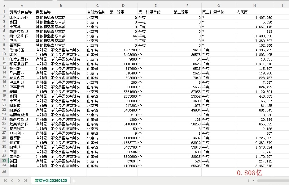 2025年12月当月,海关查询北京山东向甘李药业有注册批件的国家出口胰岛素产品总金额: 0.808亿。