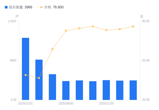 近一年(2024年12月31日至2025年12月10日),众鑫股份A股股东户数从1.26万户,减低至3966户,降幅68.64%,区间股价上涨71.54%。