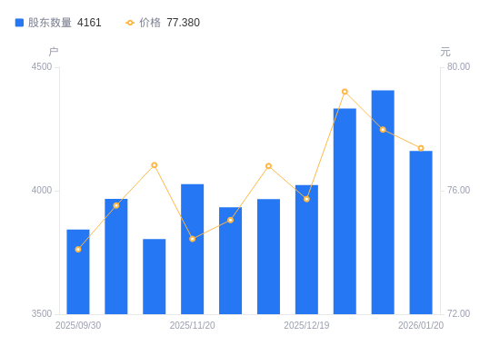 近一年(2025年3月31日至2026年1月20日),众鑫股份A股股东户数从8209户,减低至4161户,降幅49.31%,区间股价上涨77.07%。