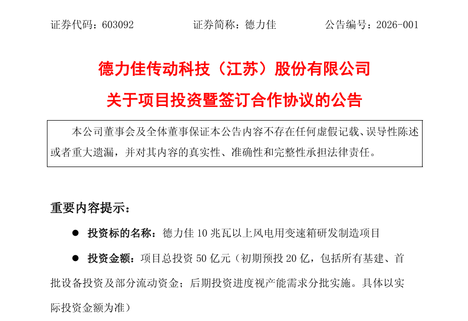 1月26日,德力佳传动科技(江苏)股份有限公司(以下简称“公司”或“德力佳”)发布《关于项目投资暨签订合作协议的公告》。