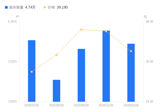 近一年(2025年3月31日至2026年2月28日),长白山A股股东户数从4.85万户,减低至4.74万户,降幅2.20%,区间股价上涨14.83%。