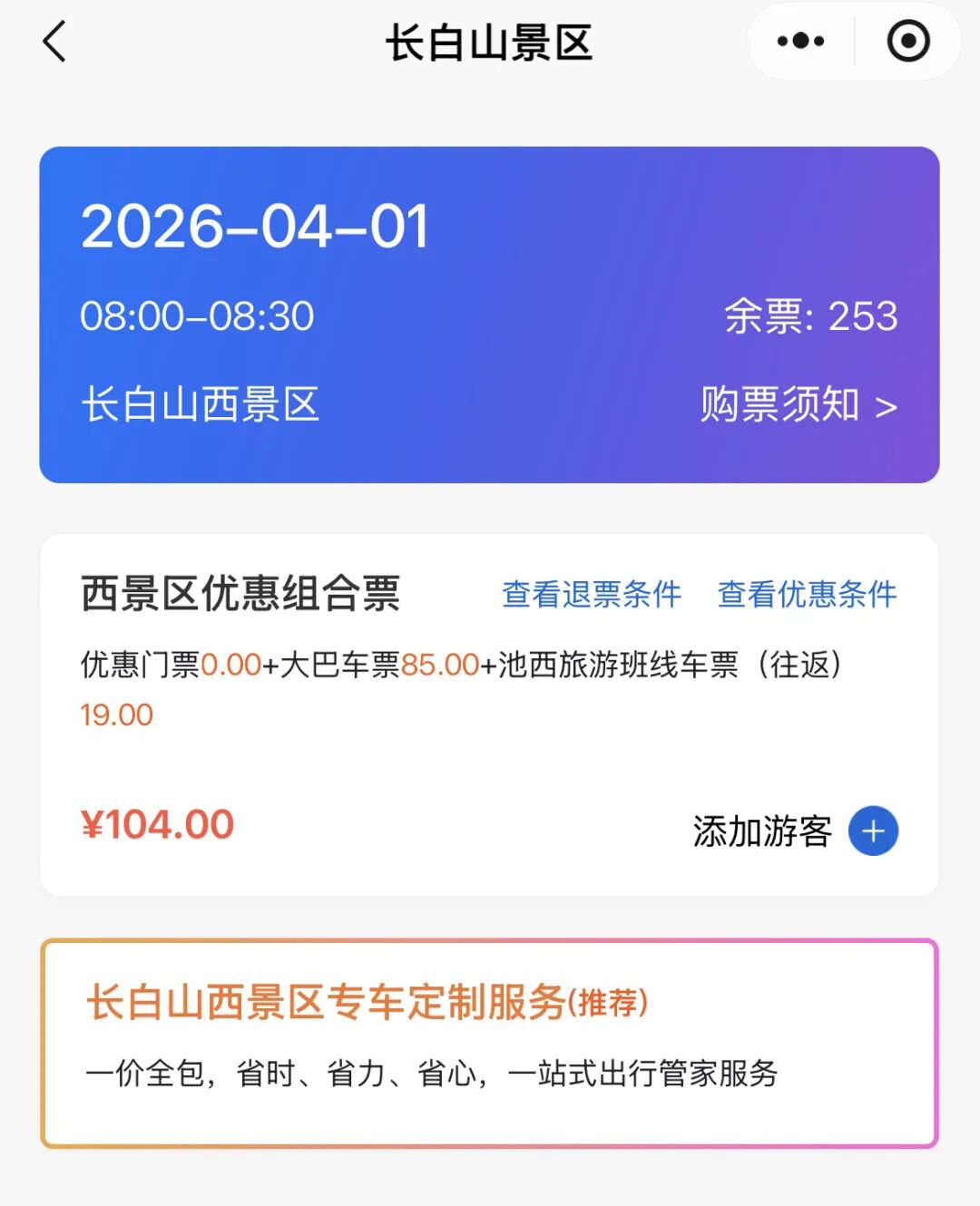 蓝鲸记者检索发现,目前长白山在售4月主景区门票中,西景区、北景区门票已显示“优惠门票0元”,大巴车、旅游班线车票则需付费。