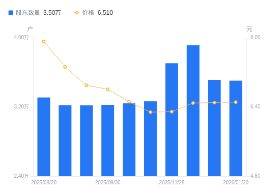 1月21日消息,数据显示,截至2026年1月20日,金能科技A股股东总户数为3.5万户,较上期(2026年1月9日)减少89户,降幅0.25%。公司最新A股总股本为8.48亿股,其中流通A股8.48亿股,户均持有流通A股数量为2.42万股,较上期增加61.39股,增幅0.25%;户均持流通A股市值15.77万元,较上期增加641.24元,增幅0.41%。