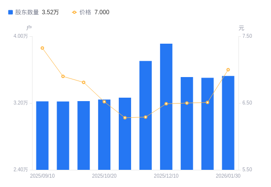 近一年(2025年2月10日至2026年1月30日),金能科技A股股东户数从3.28万户,增加至3.52万户,增幅7.45%,区间股价上涨31.46%。