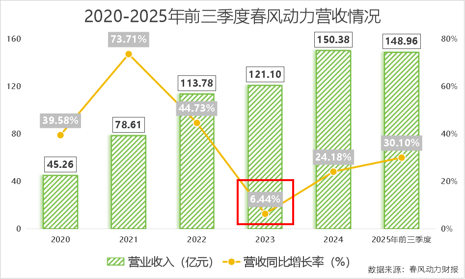 2025年前三季度,春风动力实现营收148.96亿元,同比增长30.10%;净利润为14.15亿元,同比增长30.89%。不管是营收还是净利润,都实现了高双位数大增。