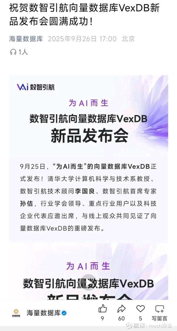对于这个数智引航,很多人没注意看以为是同业竞争,但实际上海量数据是他的大股东,属于控股关系,拳头产品VexDB也是集成了大量先进的向量化技术,在ai数据处理方面和谷歌的TurboQuant异曲同工,目前已经处于世界领先水平