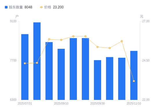 近一年(2024年11月20日至2025年11月10日),邦基科技A股股东户数从9629户,减低至8048户,降幅16.42%,区间股价上涨112.65%。