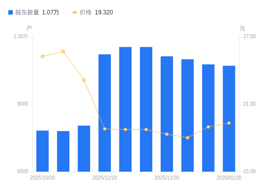 近一年(2025年1月20日至2026年1月20日),邦基科技A股股东户数从1.04万户,增加至1.07万户,增幅2.73%,区间股价上涨80.56%。