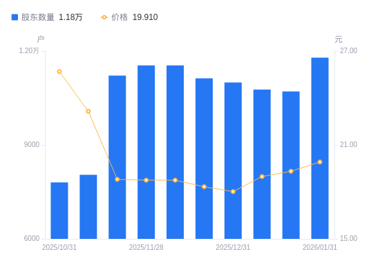 近一年(2025年2月28日至2026年1月31日),邦基科技A股股东户数从9909户,增加至1.18万户,增幅19.00%,区间股价上涨81.83%。
