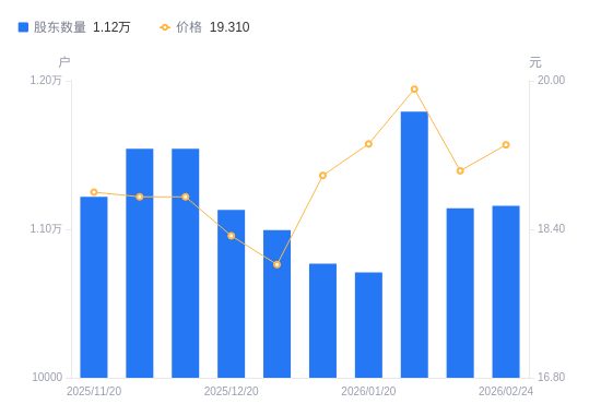 2月25日消息,数据显示,截至2026年2月24日,邦基科技A股股东总户数为1.12万户,较上期(2026年2月10日)增加16户,增幅0.14%。公司最新A股总股本为1.71亿股,其中流通A股1.71亿股,户均持有流通A股数量为1.53万股,较上期减少22.01股,降幅0.14%;户均持流通A股市值29.59万元,较上期增加3872.04元,增幅1.33%。