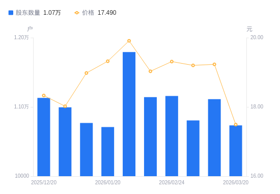 3月24日消息,数据显示,截至2026年3月20日,邦基科技A股股东总户数为1.07万户,较上期(2026年3月10日)减少379户,降幅3.41%。公司最新A股总股本为1.71亿股,其中流通A股1.71亿股,户均持有流通A股数量为1.59万股,较上期增加543.37股,增幅3.53%;户均持流通A股市值27.86万元,较上期减少1.73万元,降幅5.84%。