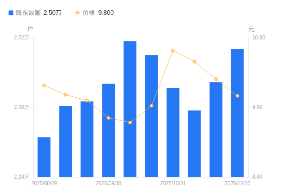 近一年(2024年12月10日至2025年12月10日),渤海轮渡A股股东户数从2.5万户,减低至2.5万户,降幅0.05%,区间股价上涨25.48%。