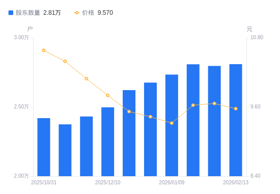 近一年(2025年2月20日至2026年2月13日),渤海轮渡A股股东户数从2.54万户,增加至2.81万户,增幅10.68%,区间股价上涨29.67%。