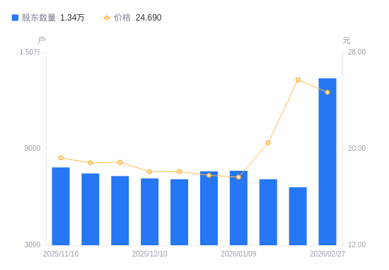 近一年(2025年2月28日至2026年2月27日),万丰股份A股股东户数从1.02万户,增加至1.34万户,增幅31.13%,区间股价上涨79.04%。