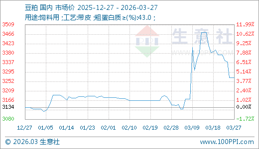 据生意社监测,豆粕03月27日最新价格3268.00元/吨,最近20天上涨3.03%,90天上涨4.28%。
